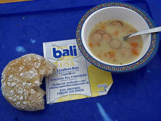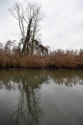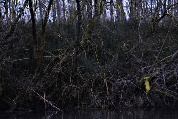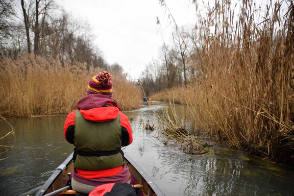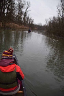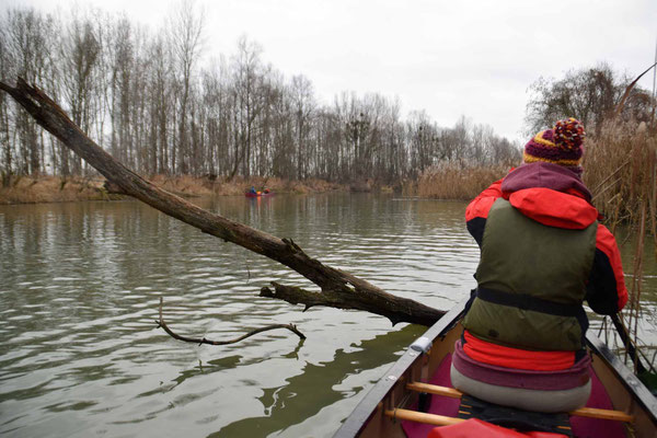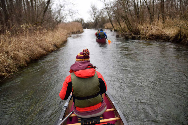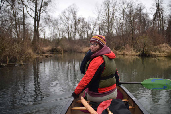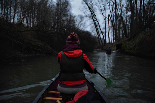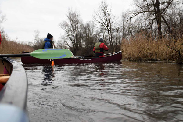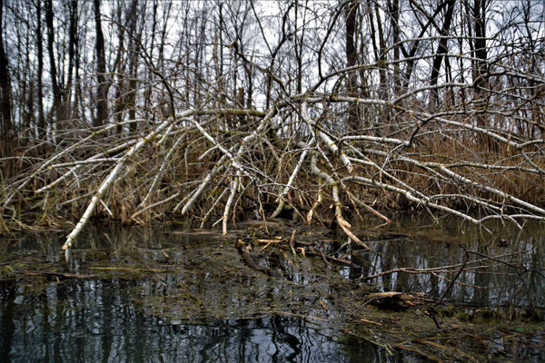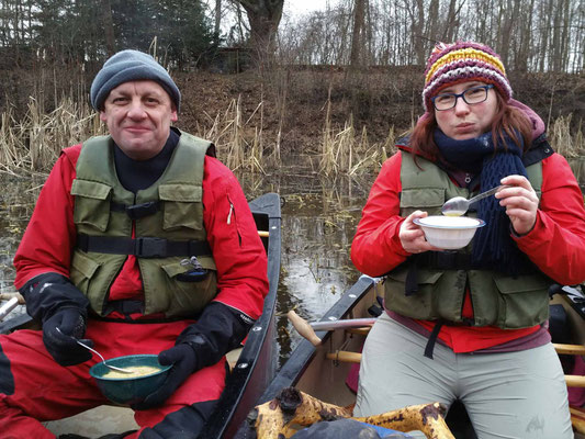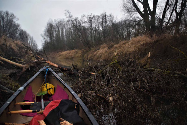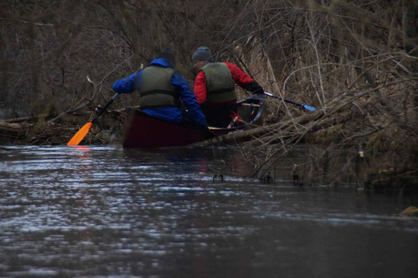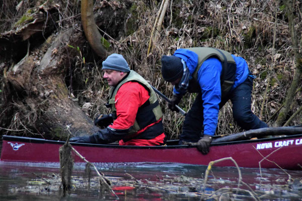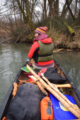 Der Tag war winterlich mit leichtem Schneefall und Temperaturen um den Gefrierpunkt. Der Wasserstand war ausreichend und wir kamen gut voran. Daß wir wegen Baumhindernissen immer wieder mal aussteigen mussten war uns sogar recht, so konnten wir uns die eingeschlafenen und klat gewordenen Fuße vertreten. Zum Wämen gab es Mittags eine Kartoffelsuppe mit Frankfurter und danach köstlichen Speck. Auch die Biber dürften hungrig sein, wie man an den häufigen Beißspuren erkennen konnten.