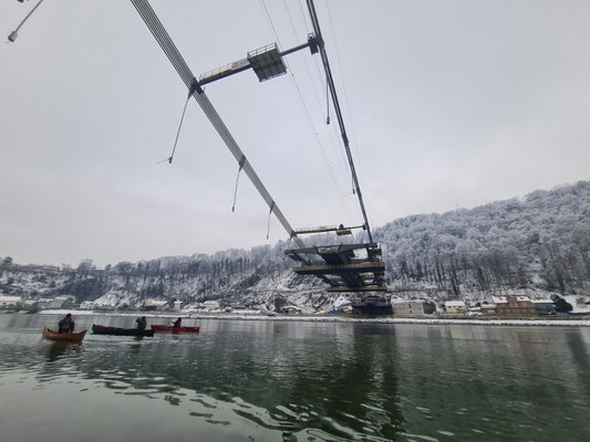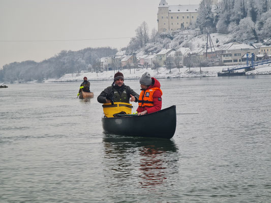 Unser Startpunkt war direkt unterhalb der Seilfähre zwischen Wilhering und Ottensheim. Hier fließt die Donau vorbei an den beiden Orten Wilhering/Ottensheim und ohne Kraftwerksanlage bis durch den Stadtbereich von Linz. Die Donau hat sich hier ein beachtliches Tal gegraben und die Hänge sind dicht bewaldet. Bei Normalwasserstand und Niedrigwasser finden sich immer wieder Uferbereiche mit Schotterflächen und Baumbewuchs die zu Rastpausen einladen. Das Wetter ist winterlich frostig, aber zum Glück geht kaum Wind, der im Donautal durchaus kräftig blasen kann.
