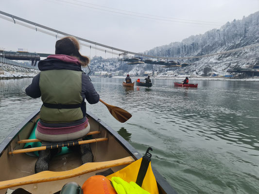 Vorbei an den Weihnachtlich geschmückten Badeplätzen geht es unter der Baustelle der neuen Hängebrücke kurz vor Linz durch. Angelegt wird dann am linken Donauufer in Urfahr, wo wir uns im Biergartl unter dem Heizschwammerl erst mal bei einem Elektrolytgetränk aufwärmen. Danach spazieren wir noch durch die Adventmärkte im Linzer Zentrum, bevor die Rückfahrt antreten und die Boote holen.